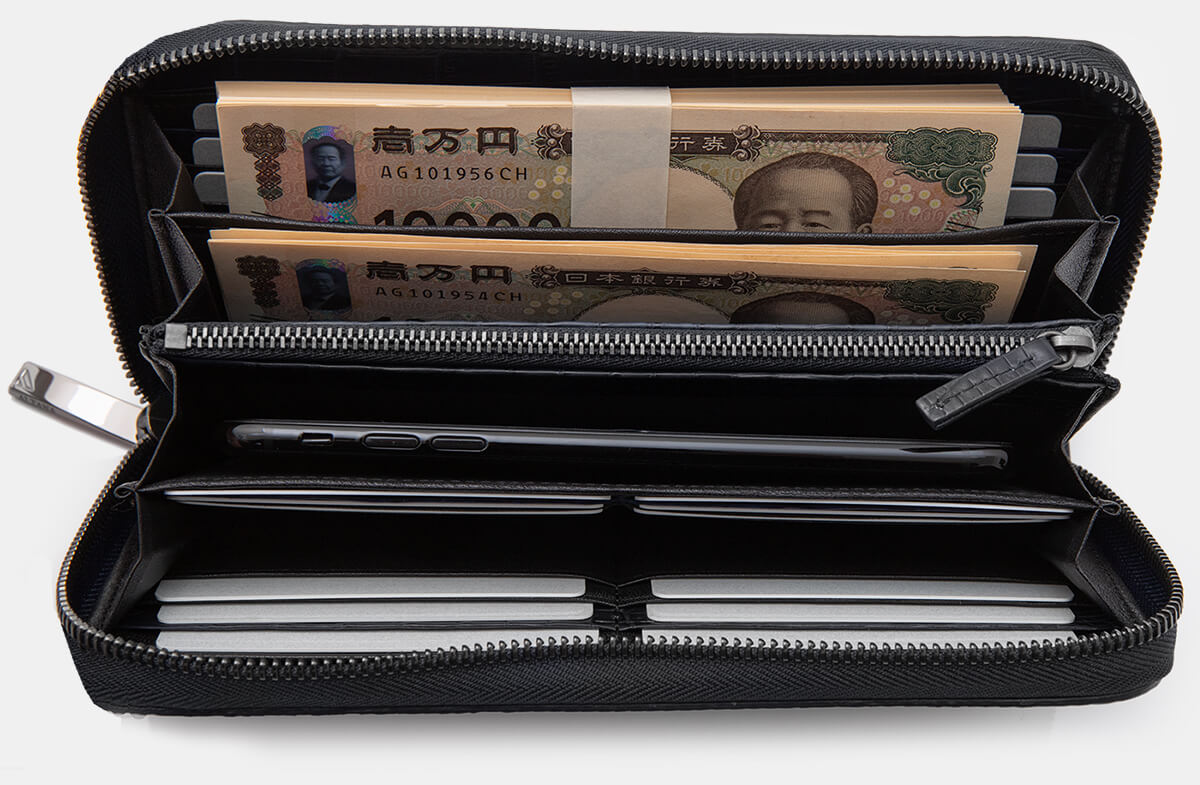 インペリアルウォレットは、紙幣200枚、カード24枚という超大容量ウォレットです。紙幣スペースの片方をスマホ収納スペースにすることで、スマホも財布の中に収納可能。通常のロングウォレットより縦長の仕様になっているため、カードや紙幣の取り出しやすさまでしっかり考えて設計されています。